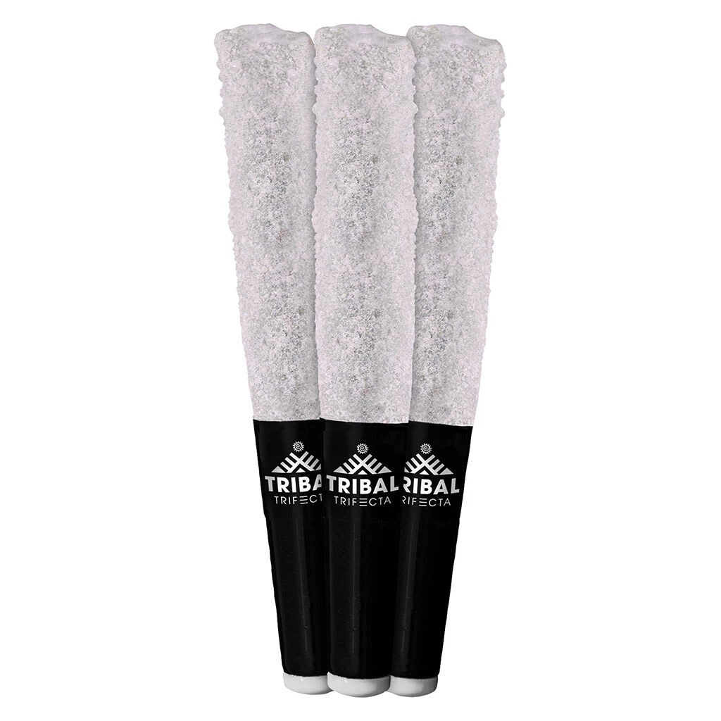 Tribal Trifecta. No fake terpenes and no distillate. Tribal Trifecta Bubble Up infused pre-rolls are made of triple infused Bubble Up flower with matching liquid diamonds, terpene sauce and dusted with THC-A diamonds. Rolled and finished with a ceramic tip. Liquid diamonds + terpene sauce + THC-A diamonds = the Tribal Trifecta.